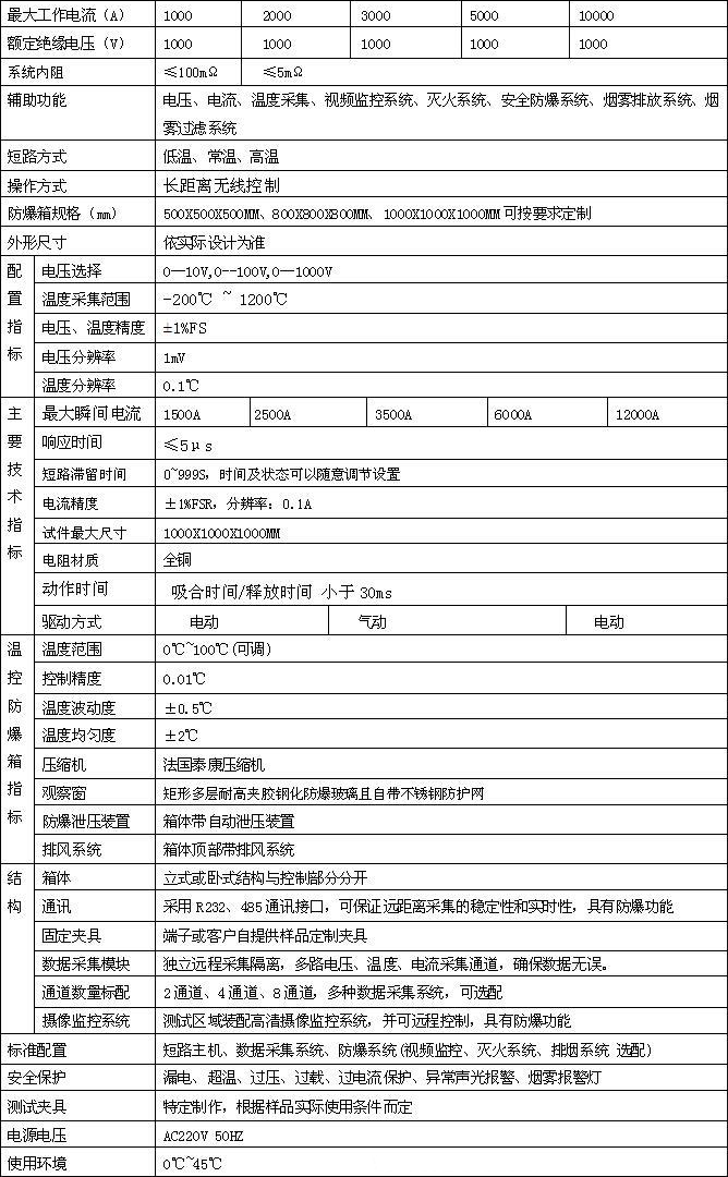 電池短路試驗機一、試驗目的: 遙控大電流短路裝置綜合多種電池短路試驗標準要求而設計按標準要求短路裝置必須符合內阻范圍遠小于100mΩ,從而獲得試驗要求的最大短路電流。二、概述: 大電流短路裝置綜合多種電池短路試驗標準要求而設計;按標準要求短路裝置必須小于5mΩ,從而獲得試驗要求的最大短路電流;另外在短路裝置的線路設計上也須能夠承受大電流的沖擊,所以我們將選用工業級直流電磁接觸器及全銅接線柱和內部銅板導流,內置主動式滾珠軸流風機提供有效散熱保護,使大電流短路裝置更安全,有效減少試驗設備的損耗,確保試驗數據的準確性。電池短路試驗結果判定標準為:電池不起火、不爆炸為合格。三、符合標準:GB/T 18332.2-2009電動道路車輛用金屬氫化物鎳蓄電池GB/Z 18333.1-2001 電動道路車輛用鋰離子蓄電池GB/Z 18333.2-2001 電動道路車輛用鋅空氣蓄電池QC/T 741-2006 車用超級電容器QC/T 742-2006 電動汽車用鉛酸蓄電池QC/T 743-2006 電動汽車用鋰離子蓄電池QC/T 744-2006 電動汽車用金屬氫化物鎳蓄電池汽車動力電池的相關標準國際標準(ISO/IEC/SAE/JEVA/CEN等)、國際標準協會及 “863計劃”電動汽車重大專項相關測試規范QB/T 2947.3-2008 電動自行車用蓄電池及充電器 第3部分DB12/T246-2005 電動自行車鋰電池測試標準。GB 19521.11-2005 鋰電池組危險貨物危險特性檢驗安全規范四、技術參數: